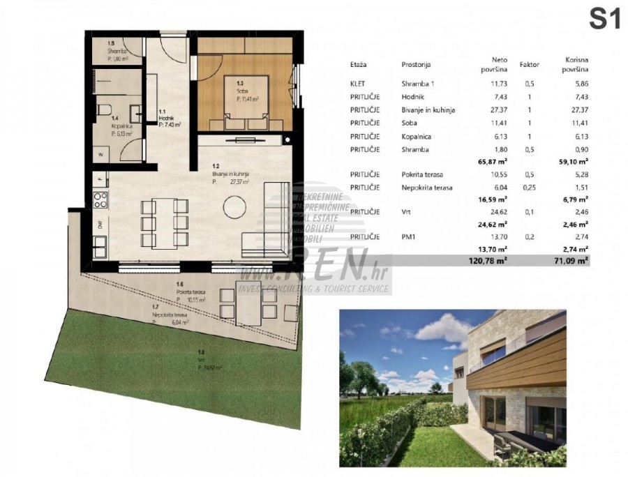 L'edificio è composto da piano terra, primo piano e seminterrato. Un totale di sei appartamenti sono disposti in unità verticali, con giardini e terrazze indipendenti.